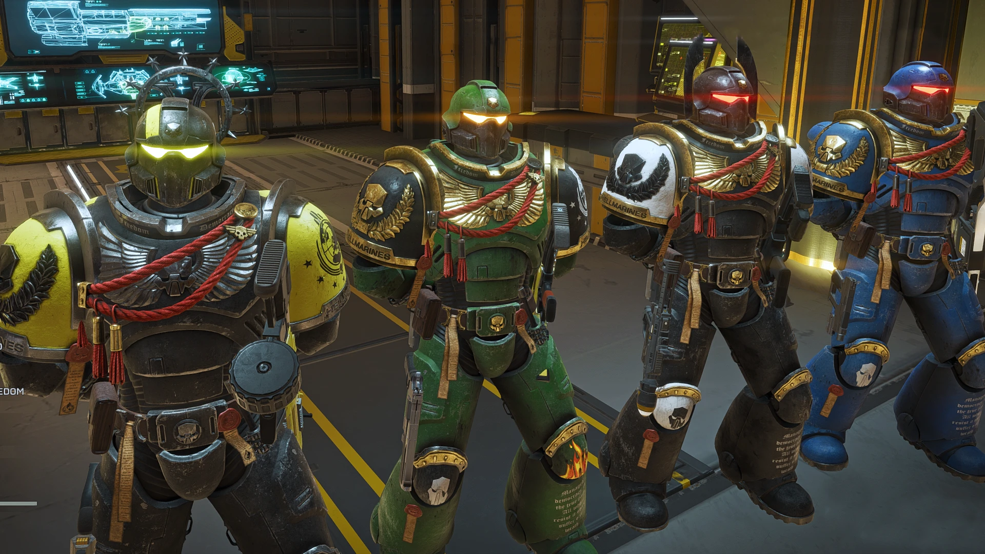 We are the Hellmarines ! A proud, battle forged brotherhood born in the ashes of Hellmire, risen to serve the glorious Emperor of Super Earth! In the darkest fires and chasms of Hellmire we endured trials no mortal could survive, crafted by the relentless rigors of Hellmarine training. Only the toughest, bravest souls became worthy to wear the power armor of the Hellmarines.